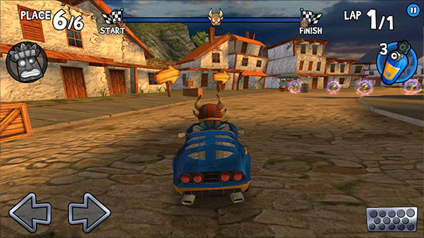 6、方向靠左右按键或倾斜手机控制,右下角是刹车,右侧大按钮是角色技能,关键时刻点一下能逆转局势。