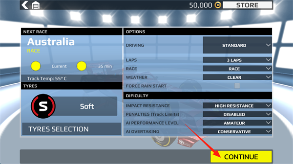 在比赛开始前,可根据个人喜好设定初始轮胎类型、天气状况及比赛圈数。新手建议先从晴朗天气和中等圈数开始练习。