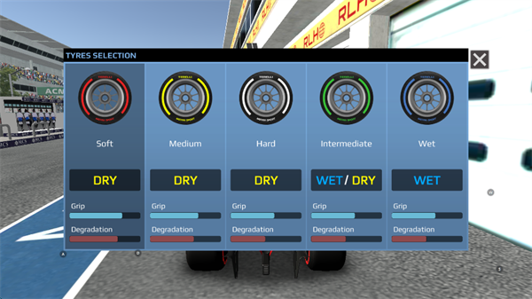 2、策略性轮胎管理:赛前及进站时可自由选择软胎、中胎、硬胎、雨胎等5种轮胎,每种轮胎在抓地力、极速与磨损上表现各异;
