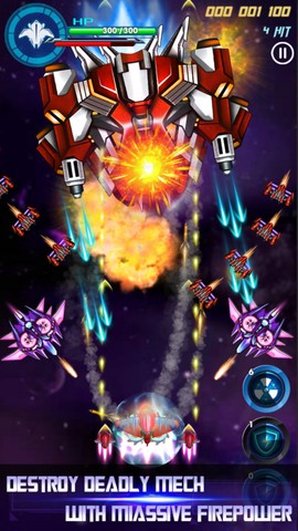 1、手指在屏幕左侧滑动控制战机移动,动作很跟手,轻微晃动就能躲开密集弹幕。