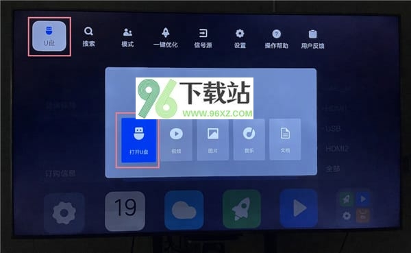 2、将U盘插到电视上,在弹窗上选择“打开U盘”,如果未弹出,可在电视首页最顶部,按“上”键,找到U盘。