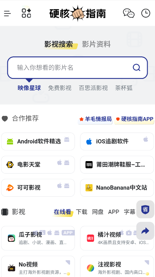 硬核指南是个主打影视资源聚合的工具型平台,打开就能用,不用折腾注册登录那一套。整个界面清爽干净,看剧过程中也不会突然蹦出广告打断体验。里面整合了电影、电视剧、综艺、动漫还有短剧等多种内容,想找什么直接搜就行。除了影视,还能顺手下载音乐、阅读、游戏或者实用小工具类的应用,覆盖安卓、电脑、电视等多个终端,基本满足日常娱乐需求。
