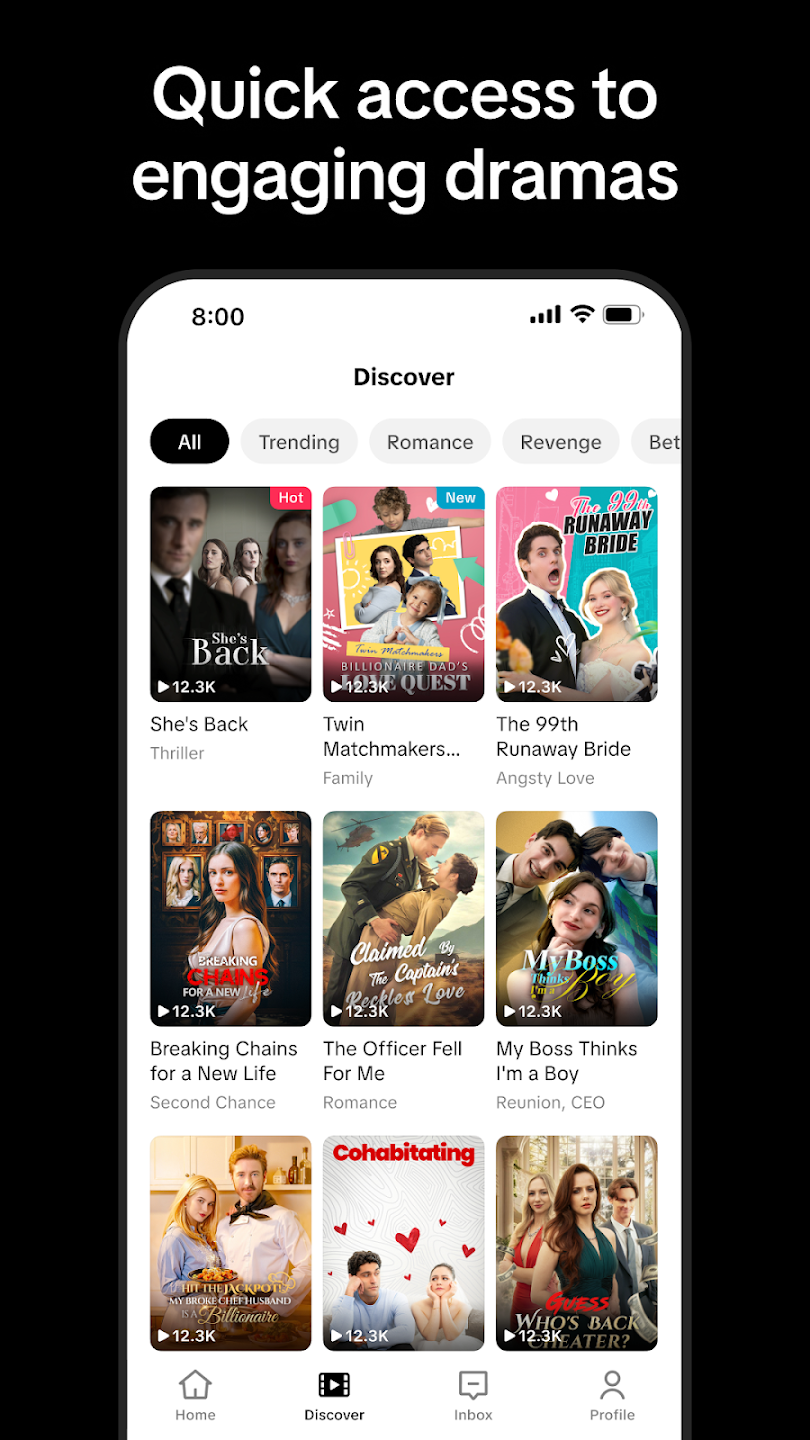 PineDrama是TikTok官方推出的一款专为海外用户打造的短剧平台,里面汇集了大量本地化制作的迷你剧集。虽然整体界面保留了一点中文痕迹,但剧名、简介和互动内容基本都是英文呈现,剧情风格虽延续了熟悉的爽剧套路,却在角色设定和文化背景上更贴近欧美观众的口味。操作逻辑和国内常见的红果视频差不多,用起来没什么学习成本。