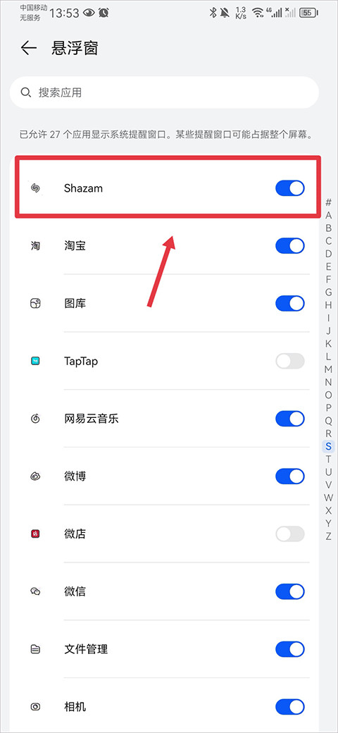 2、在应用列表里翻到Shazam,把右边的开关打开,允许它显示悬浮窗。