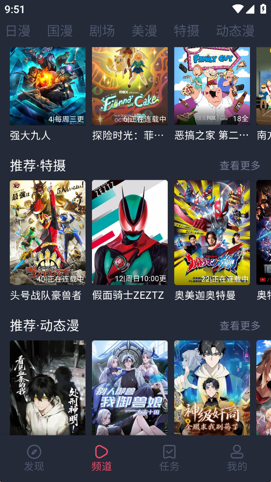 1、启动App后,首页会按类型、热度或更新状态展示各类动画,一目了然