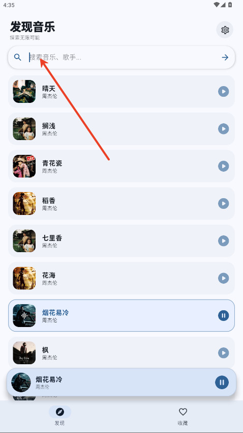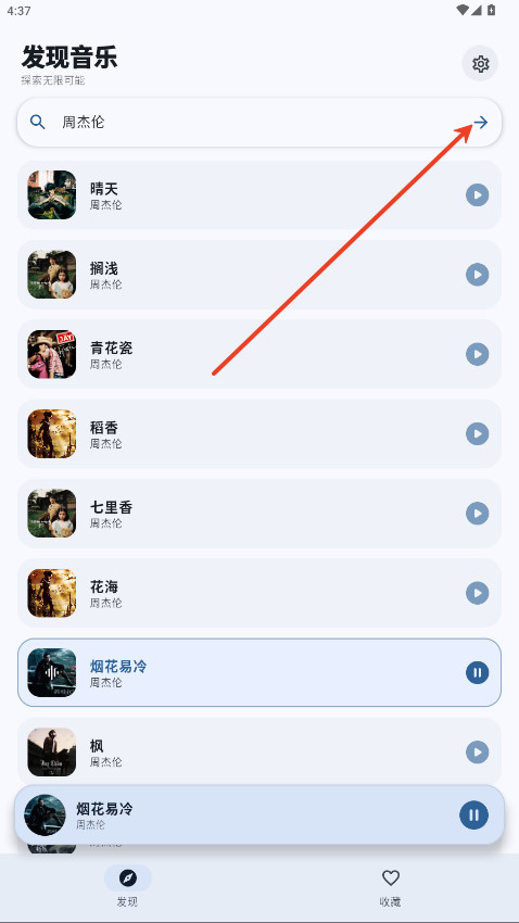 2、输入你想找的歌名或者歌手名字,输完点右边的箭头开始搜