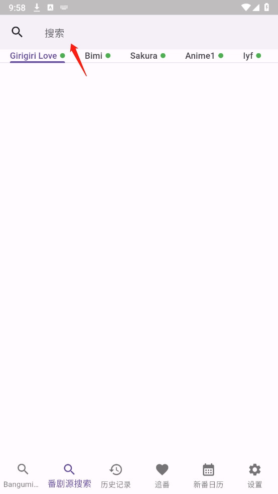 1、启动软件后,点左下角那个“番剧源”入口,就进到搜索页面了。