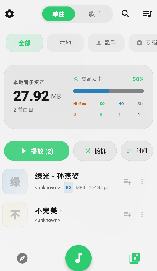MonoMusic刚装好的时候是空的,里面一首歌都没有。用户得按照下面说的方法把手机本地音乐扫进来,或者连上NAS、坚果云这类私有云盘,才能真正开始用。整个软件界面特别干净,没有广告,也不强制注册登录,操作起来很顺手。扫描歌曲时有个高级模式可选,不开也能正常扫。听歌过程中还能收藏喜欢的歌,或者设置睡眠定时,晚上躺着听歌更方便。