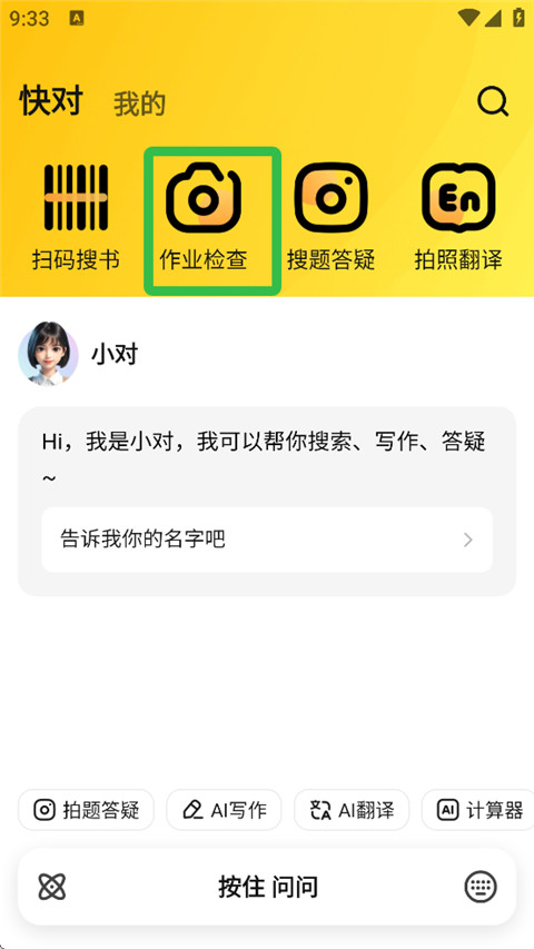 1、先打开快对AI,首页顶部就能看到“作业检查”这个入口,点进去就行。