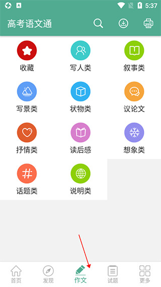 想找写作素材的话,底部有个作文专区,点进去按需求选类型就行,操作很直观。