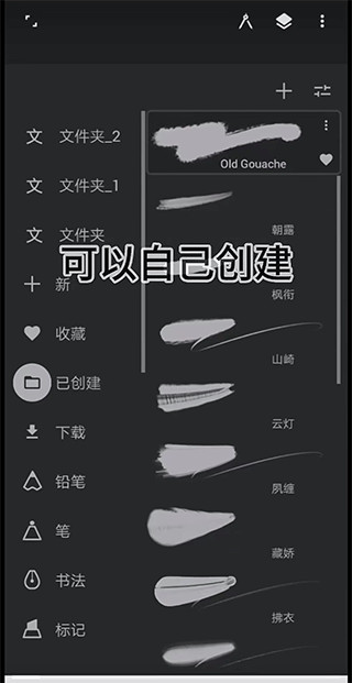 左侧有个"已创建"的选项,在这里可以自己动手做专属笔刷