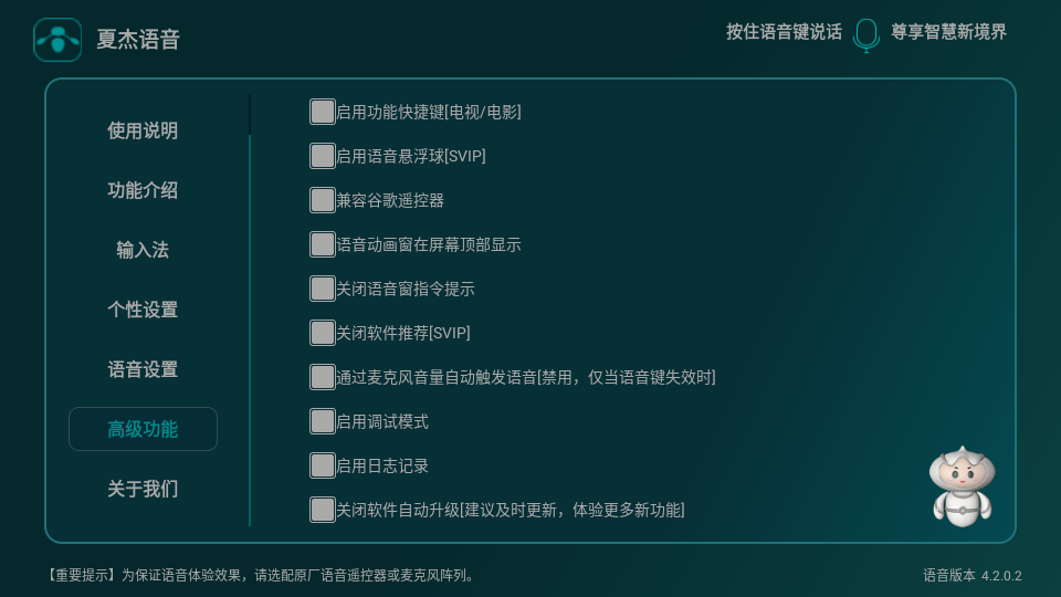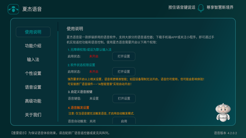 夏杰语音TV版是由深圳品索科技开发的一款智能语音交互工具,手机和电视用的是同一个安装包,系统会自动识别设备类型并切换合适的界面。装在电视上后,用户能直接用说话的方式换台、点歌、搜视频,甚至聊聊天,支持多种方言和外语,识别又快又准。