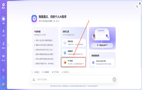 1. 打开通义官网 https://tongyi.aliyun.com/qianwen/,找到“效率工具”里的“PPT创作”入口。