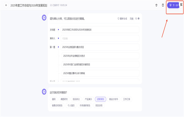 3. 系统会自动生成内容大纲,确认没问题后,点击右上角继续。